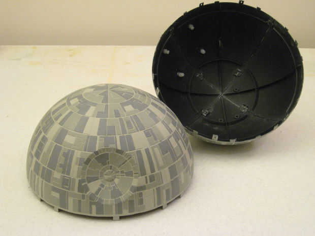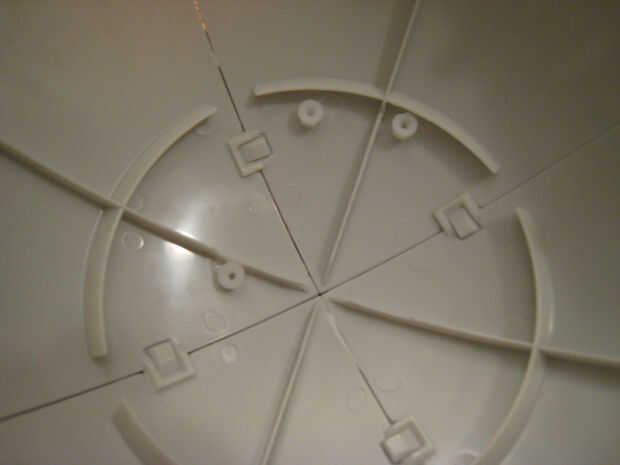 8, 1/8 agujeros alrededor el superláser teniendo en cuenta la estructura plástica en la parte posterior del taladro. Taladre los agujeros para el sensor de movimiento hacia el frente y hacia abajo, ampliar con una dremel. Agujero de taladro y dremel para el enchufe de alimentación. Uso 1/8" pedacito de taladro y taladrar dos orificios para los botones en la parte posterior hacia abajo.