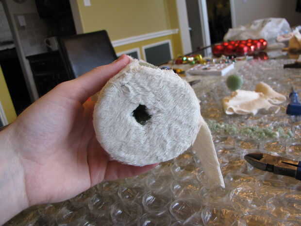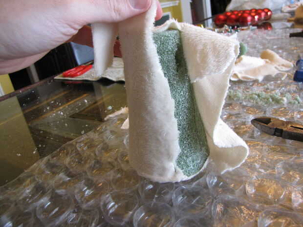 -Utilizando una mezcla de doblar ganchos de ornamento de la Navidad y pegamento caliente, fijar la tela a la base de espuma de poliestireno. (Nota: pegamento caliente puede derretir la espuma de poliestireno, pues utilice el pegamento con moderación y tratar de enfriarlo rápido)