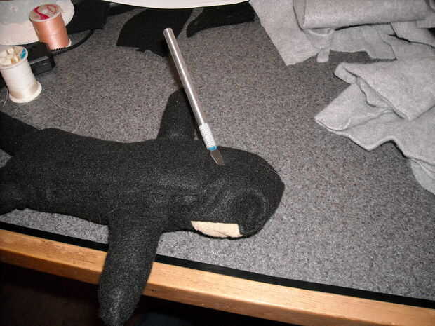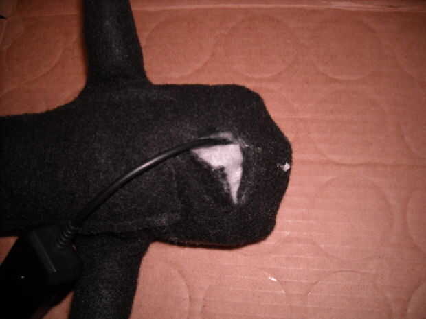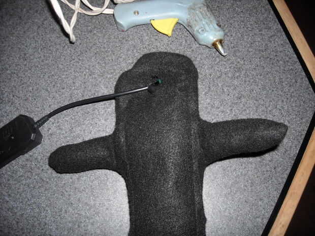 Cortar un agujero en la parte posterior de la cabeza Radnors que usted será capaz de montar los LEDs a través de y ser capaz de situarlos donde pertenecen. Corté una lateral en forma de T, que trabajó bastante bien. Meter todo menos el cable con el interruptor y las baterías en él.
