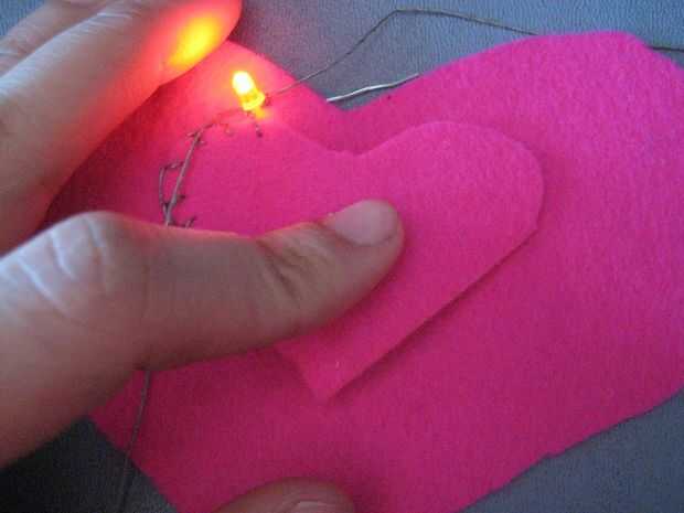 Cuando usted presiona el corazón de la batería a la batería, el LED debe encenderse! Si no lo hace, asegúrese de que ninguna de las conexiones positivas (hilo y puntas LED) toquen alguna de las conexiones negativas. (Cuando toque positivo y negativo, esto es un "corto circuito" que no va a funcionar).