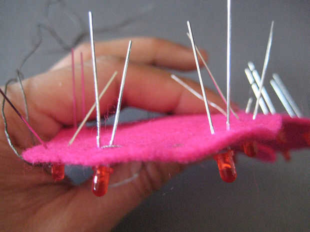 La parte posterior de la parte delantera de la almohada ahora está un poco desordenada. Deberás tener cuidado con esto cuando se conecte y pruebe cada luz--Asegúrese siempre de que no toquen las conexiones positivas y negativas!