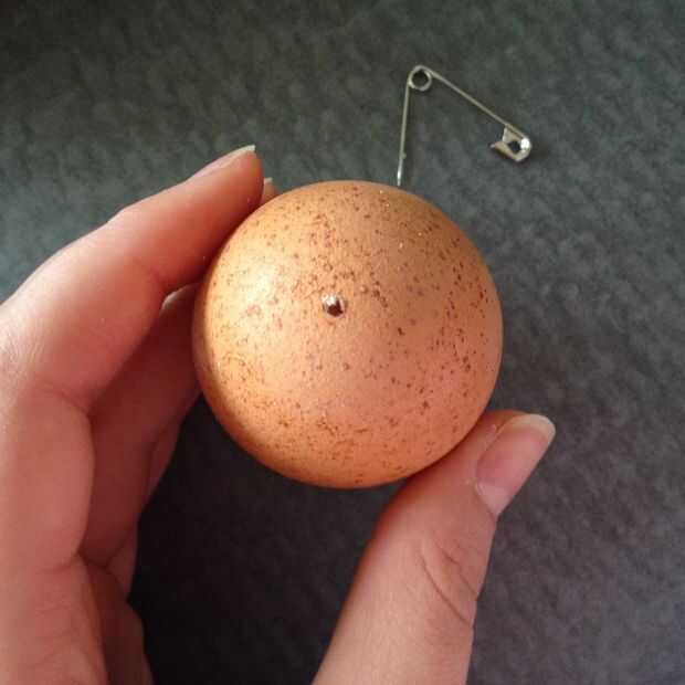 Comienzan sosteniendo el huevo en la mano no dominante. Haga un orificio en la parte superior e inferior del huevo con un alfiler. Realizar los orificios más amplias con el pasador.