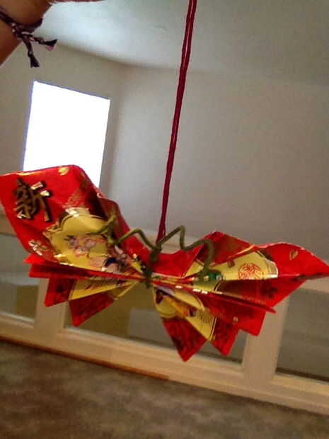 Mi tía compró una mariposa circular móvil siglos atrás, y ella lo tiene colgado en su tintorería y tienda de alteraciones. Ella me preguntó si podría crear una decoración de compañero como él para la ventana de la tienda. Verás, la tienda tiene un pe