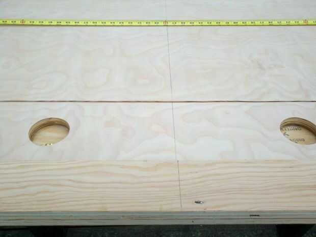 c. (no mostrado) cortar la BASE. Ahora usando su sierra caladora o sierra circular, hacer su corte a lo largo de la línea de corte de BASE. (Recuerde que esto es compensado de la línea de centro por 1/2"). Asegúrese de que usted está apoyando a ambos lados del tablero con una tercera vieron caballo u otro soporte antes de realizar el corte.