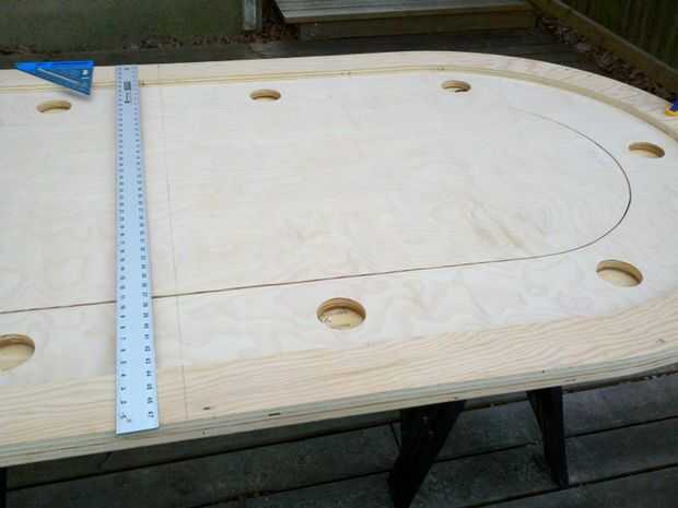b. (no mostrado) marcar la BASE de corte de línea (offset). Quitar el relleno y extender su línea de centro en la BASE entre los hipódromos. Ahora quite la pista de carreras en conjunto y dibujar la línea de corte en el BASE offset 1/2" a cada lado de la línea central. Se trata de donde cortamos la BASE para crear la superposición conjunta antes mencionado.