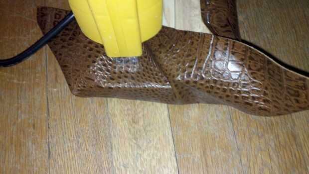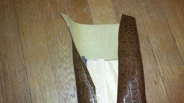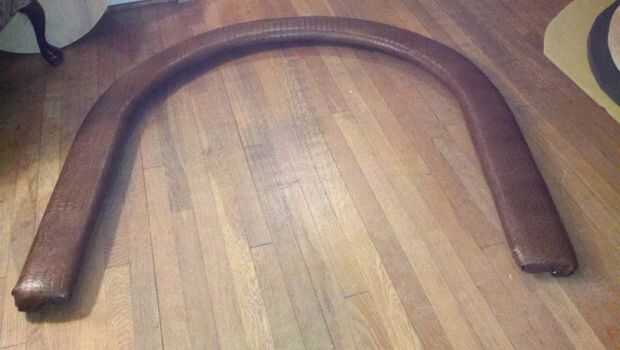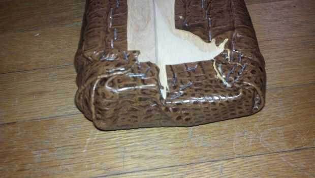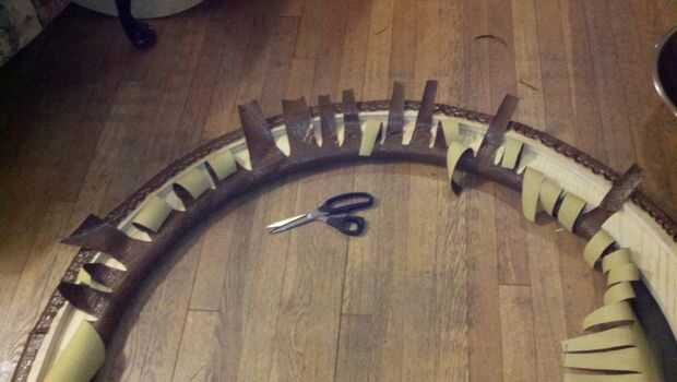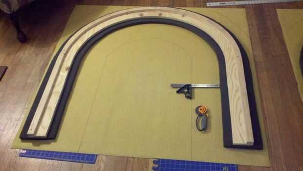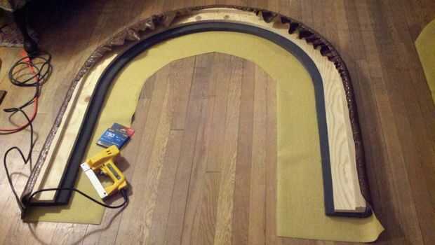 i. (cuadros 25) Pizza corta el interior borde del arco. Aquí está la parte difícil. Para hacer el interior curva del arco tienes que hacer radial corta desde el centro del arco hacia el exterior. Hará una serie de estas que cubren el arco entero (no hay necesidad de continuar con estos cortes en los bordes rectos. La parte difícil es saber cómo profundo para cortar. Si se corta a la profundidad (es decir. muy cerca de la espuma) su corte será visible en el producto final (no deseado). Si no cortó lo suficientemente profundo, no tendrás suficiente holgura a rodar los vinilos el interior borde. Recomiendo que erraba en el lado de corte corto. Siempre puede extender el corte que necesite una vez que empiece su grapado. Comencé cortando hasta unos dos dedos de la espuma. Tuve que extender estos recortes, pero sentí que permanecía en el control de esta manera.