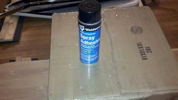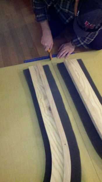 e. (cuadros 13 y 14) pegar la espuma de relleno en el riel de madera. Rocíe el spray adhesivo tanto la superficie superior del riel, y la superficie de la espuma. Coloque el carril de vuelta encima de la espuma alineándola con sus marcas de referencia anteriores y luego de peso hacia abajo dejándola secar durante 10-15 minutos. Usé el inserto presentado a través de los dos lados del carril con una caja fuerte en la parte superior para proporcionar incluso ponderación como se seca. Repita para la otra mitad.