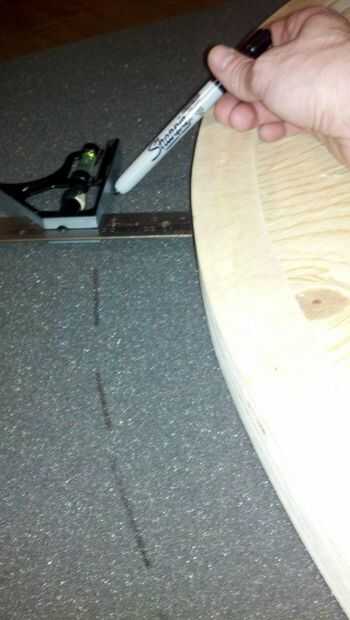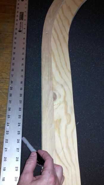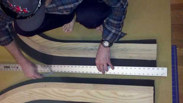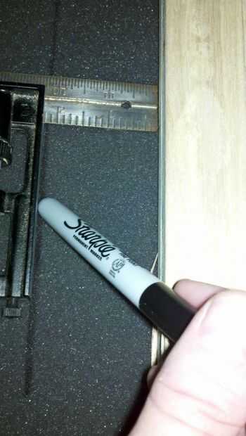 c. (cuadros 10 y 11) marcar el interior línea. Ahora repita el mismo proceso para el interior borde. Deberás hacer un corte en el medio con el fin de la aleta una pieza de espuma para determinar el ancho de su margen (cuadro 10). Marque puntos de referencia a lo largo del borde exterior e interior de la baranda de madera (para asegurar que puede realinear el riel con la espuma más adelante).