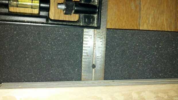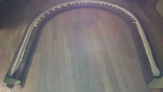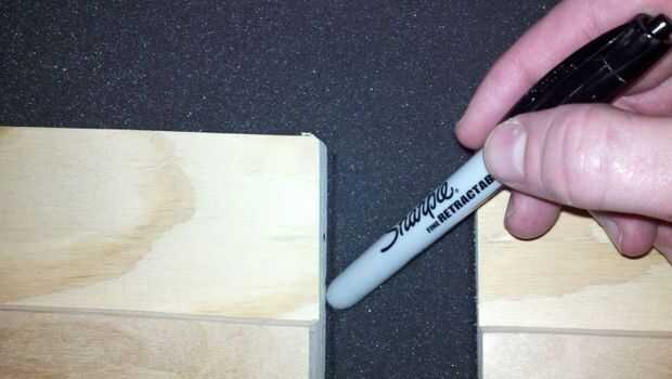 b. (cuadros 3-9) marcar la línea de corte exterior. Queremos que la espuma para envolver alrededor del lado del carril que se extiende hasta el borde inferior del travesaño en ambos el interior y el exterior. Usando su rodillo de mano el borde de corte en a un lado del riel y la posición del riel hasta llegar buena alineación (Fig. 3). Una vez que está satisfecho, utilice una escuadra de combinación para medir esta distancia. Como se puede ver, mina fue aproximadamente 2 1/4" de la guía (cuadro 4). Ahora utilice la Plaza y un marcador Sharpie para dibujar la línea de corte alrededor del riel (cuadro 5-7). Ahora marque el borde de la baranda en las uniones entre las dos mitades (cuadro 8). En este punto donde se unen las dos mitades, queremos que la espuma a cortarse al ras con el borde como se puede ver en los cuadros 8 y 9.