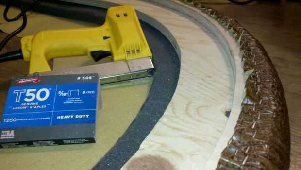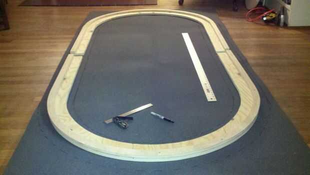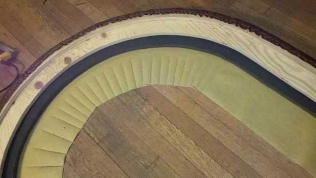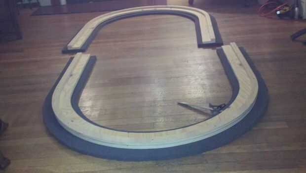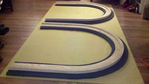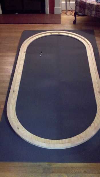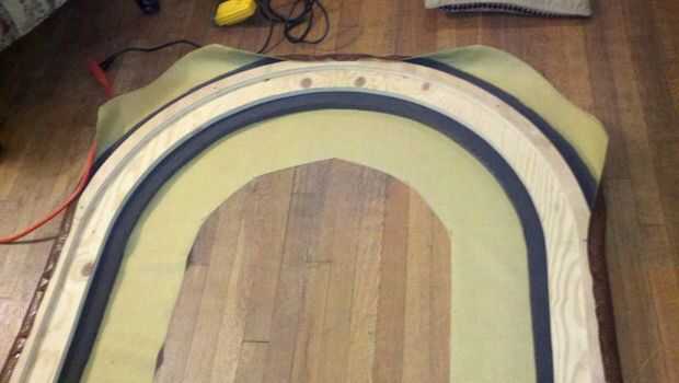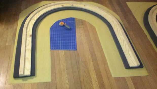 g. (fotos) 20 - grapa el borde exterior. Esto es donde se necesita un sistema adicional de las manos. Una vez que comenzó, usted puede lograr que se haga por sí mismo, pero no tratar de que esto va solo. Usted será probablemente acabe con la tensión desigual y un final desordenado. Una grapadora eléctrica es oro aquí, pero si debe usar una grapadora manual, que funciona muy bien. De cualquier manera, asegúrese de que usted aplique mucha presión hacia abajo cada vez apriete el gatillo. Esto es donde usted realmente necesita un asistente porque esto se hace mejor con las dos manos (uno en el gatillo, uno en la parte superior de la grapadora). Doble vinilo, balanceo la espuma sobre el lado de la barandilla y grapa en la parte inferior del tablero ferroviario. Todas sus grapas para el borde exterior deban ser en la más fina pieza de adorno de carril. (Si te retiras cualquier cosa sobre el borde interno, interferirá con la instalación del riel en el pedazo de pista de carreras. Comenzar con los larga rectos bordes y el ápice del arco (Foto 21). Aplicación de grapas, es un buen patrón para utilizar un proceso de "dividir". por ejemplo, colocar una grapa en cada extremo y uno en el centro. Luego dividir la diferencia y colocar otra grapa a medio camino entre los dos primeros. Luego dividir la diferencia una vez más, cada vez dividiendo las grapas en medio hasta que esté toda completa. De esta manera puede mantener la presión uniforme y evitar pliegues exceso. Vas a usar un montón de grapas (prácticamente una línea continua de grapas). Recomiendo tener dos cajas por lado. He utilizado T50 plana de 5/16" grapas de alta resistencia.