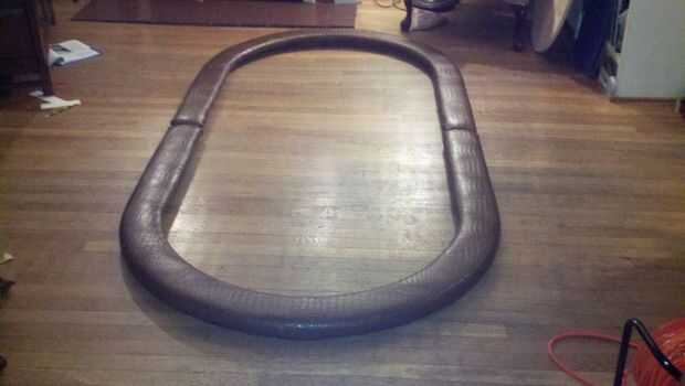 l. (cuadros 28-30) Grapa y recorte los extremos. Los extremos son esencialmente ningún diferentes que envolver un regalo. Lo mejor que puedas para plegar cuidadosamente, grapar y cortar. También quieren ser conscientes de que los extremos en ambas mitades del riel se cumplir y ser visible en la mesa montada. Tanto más se ven, mejor será, así que trate de hacer lo mismo en los cuatro extremos. Mina terminó un poco desigual, y es visible (aunque no crítico)