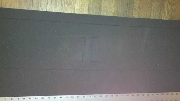a. (Foto 2, 3) diseño de la hoja de 1" de vinilo sobre un piso firme. Te recomiendo trabajando en una superficie de limpiar así que tratar de encontrar un espacio interior lo suficientemente grande como para trabajar y barrer y trapear antes de comenzar. Si no tienes esta opción, coloque una hoja o paño hacia abajo para trabajar a mantener que limpian tu vinilo y tela. Coloque ambas mitades de la parte superior del carril hacia abajo sobre la espuma con un pequeño espacio entre las dos mitades. Le ahorrará un corte si alinean de un lado del carril con uno de los bordes del cortados de la espuma.