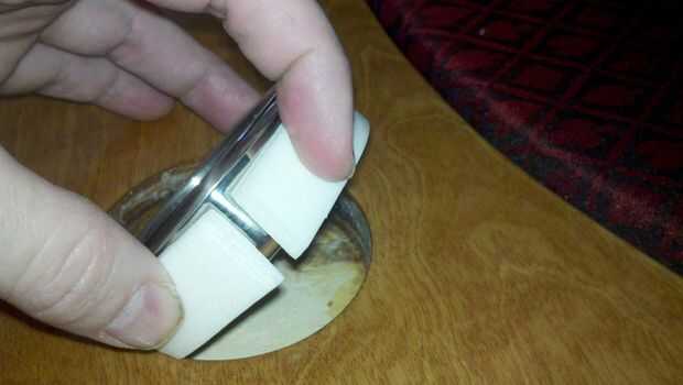 b. (cuadro 1) deformar la tira de espuma alrededor del sostenedor de taza y corte a la circunferencia de la Copa. Inserte la taza con la espuma en la bodega en el hipódromo. Cola no es necesario. Empuje apretado para que el anillo de lo portavasos está al ras con la superficie de la pista de carreras.