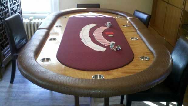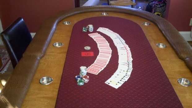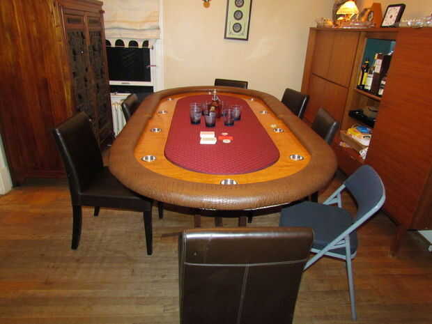 mi esposo y yo somos fans de poker grande. Nuestra mesa estaba envejeciendo y no ve bien en todos. Desde entonces estaba aún robusto y de gran tamaño, decidimos convertirla en una mesa de póquer permanente.Nuestro primer intento (cuadros demostrados)