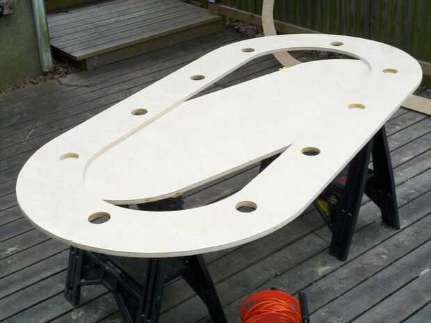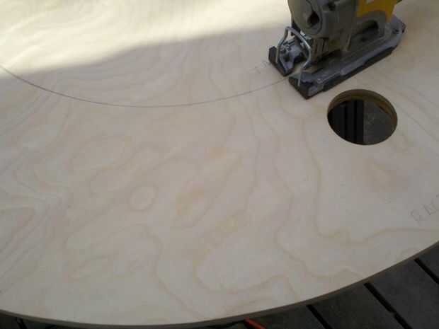 a. Inserte su rompecabezas en el orificio de salida. Trate de minimizar el daño a ambas piezas, pero mantener la hoja en el lado de la estufa como se empieza. Vamos a volver atrás y tapar ese agujero en la inserción con masilla para madera. El relleno entonces se cubrirá con tela para que no ver. Pero la línea de pista de carreras visibil en 360 grados.