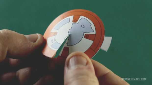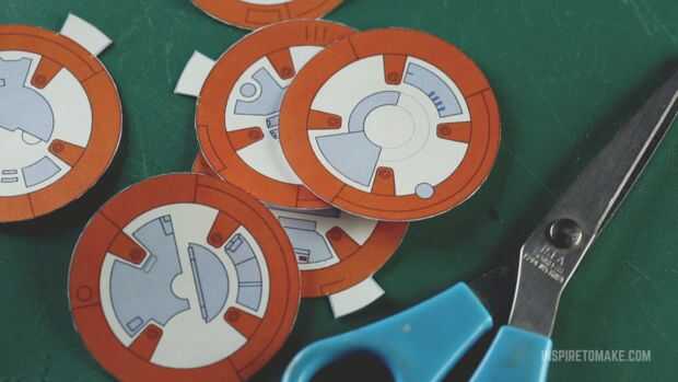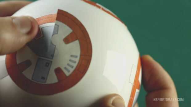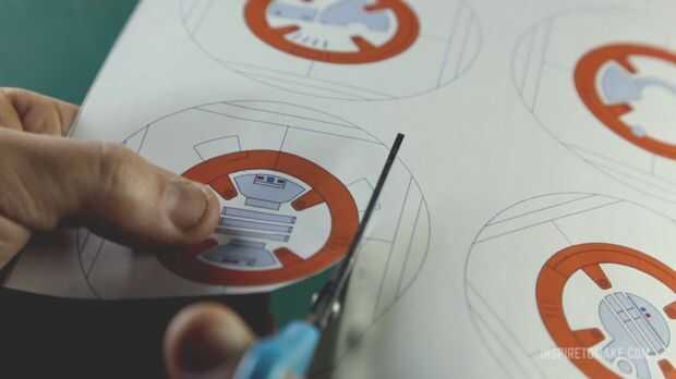 Entra aquí y haz una plantilla para imprimir pegatinas laterales para el droid. Si no tienes un documento de etiqueta que puede imprimir en un papel normal cuando pegue al ornamento. Hacer un corte desde el borde hasta el medio de la etiqueta engomada, que le ayudará para envolver alrededor del lado de la bola.