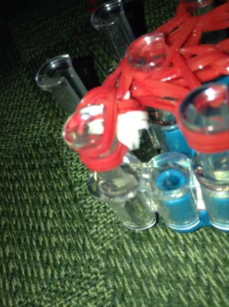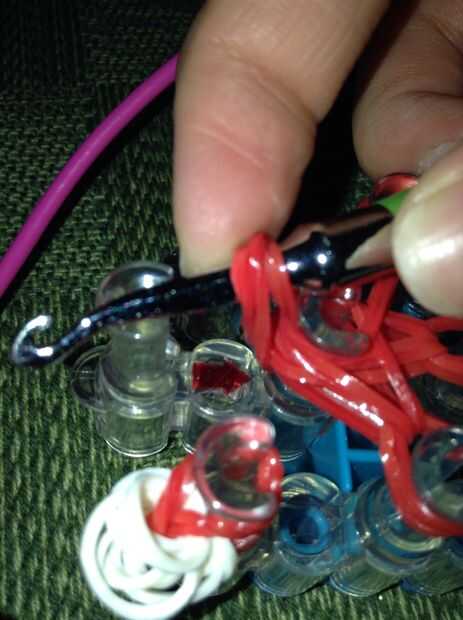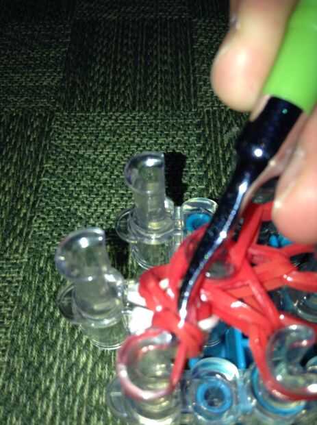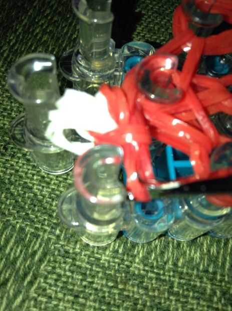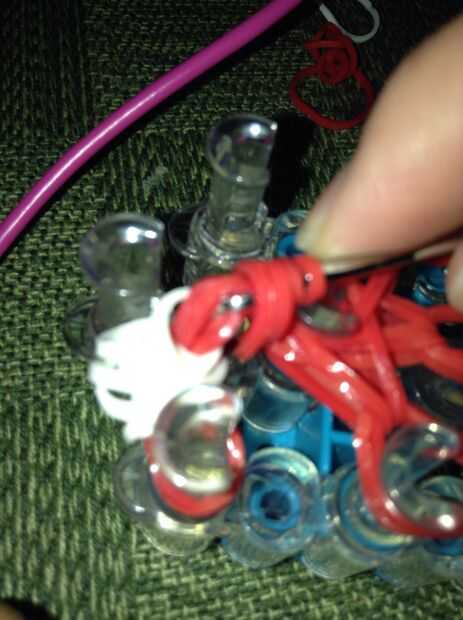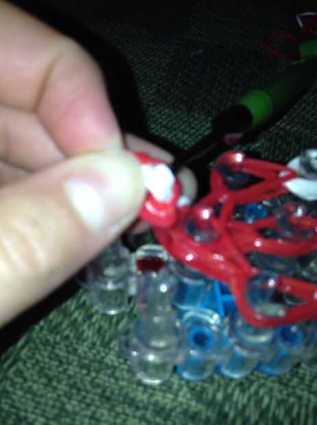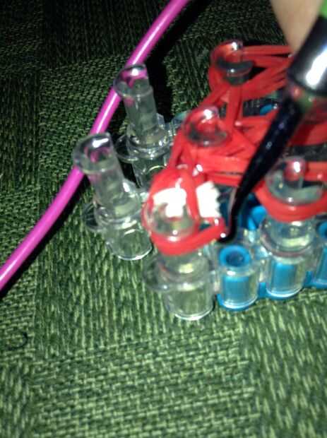 Levante el pasado bandas de su telar y tire de un lado de tu pompón a través y después póngalo detrás al pin. Agarra las bandas dos la parte inferior y tire de ellos sobre los otros dos y sólo les deja ir. Luego agarra sus otras dos bandas y tire sobre su pompón.