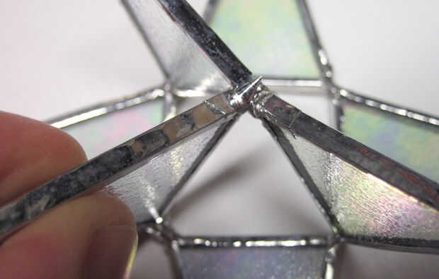 Terminar la estrella por sobre las restantes piezas del lado de soldadura. Encontrar ayuda para colocar una pequeña cantidad de soldadura tac directamente en las esquinas de la base de los puntos del triángulo. Coloque una esquina base a una articulación en el marco de grandes y la otra esquina base a mitad de la perpendicular de la mitad de la base sobre el centro de la base grande. Hacer esto para el otro lado.