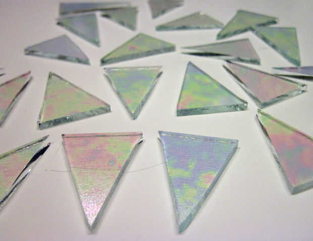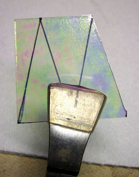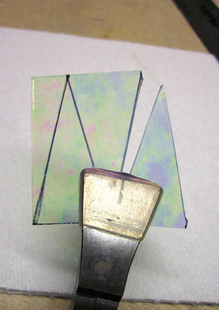 Romper cada triángulo con su pinza de corriente. Observe que mi triángulos de vidrio no se dividen perfectamente en las esquinas de su base. Esto está bien. Te le escondes estas pequeñas imperfecciones en el interior de la estrella y en papel de aluminio y soldadura.