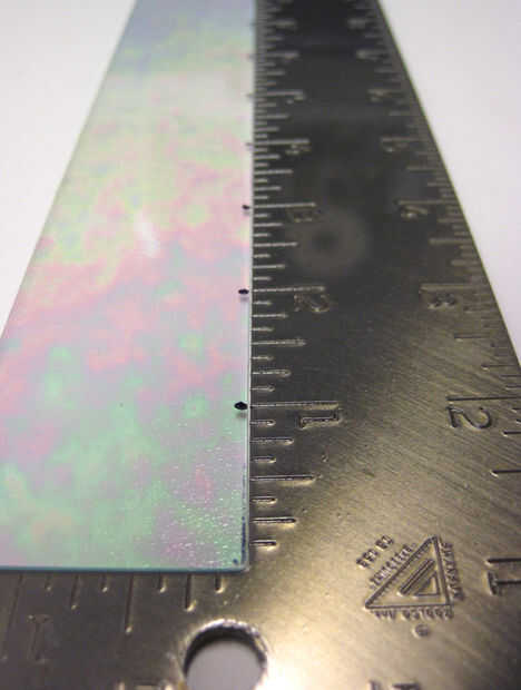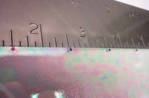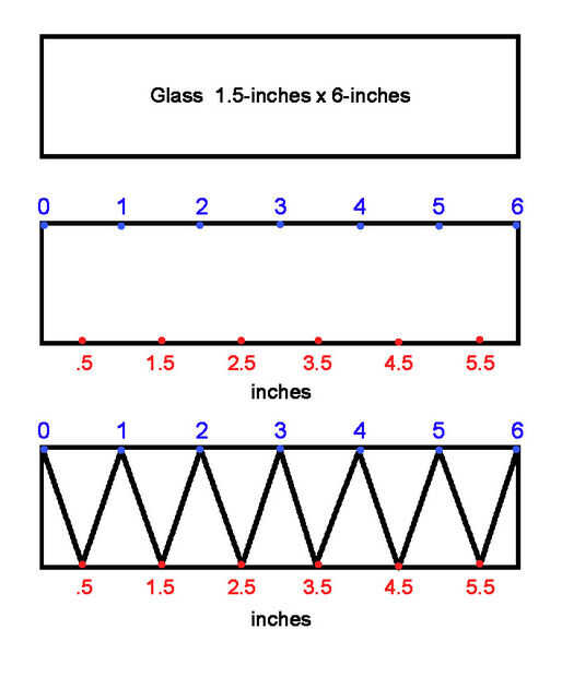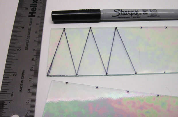 Usando la regla, marca puntos cada 1 pulgada a lo largo de la tira del vidrio a cortar. La regla al otro lado del tirón y marcar puntos en cada pulgada de 1/2. El espacio entre estos puntos será las bases de los triángulos que forman los puntos de la estrella. Si opta por hacer dos puntos de diferente tamaño, para ello a la otra franja de vidrio también. Las bases de los triángulos deben ser del mismo tamaño.