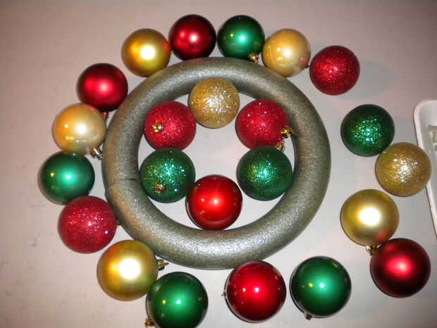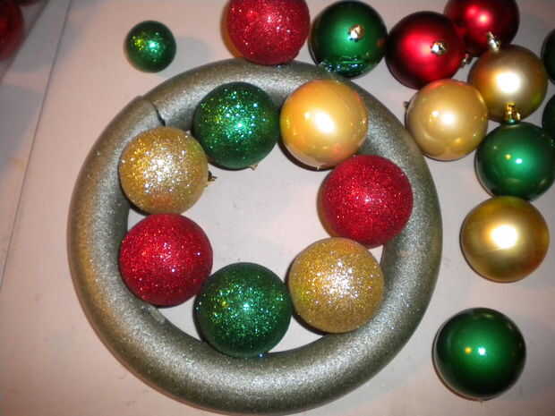 Antes de cualquier cosa abajo, I poner pegué los adornos hacia fuera alrededor de la corona para tener una idea de cuántos iba a utilizar y qué tipo de patrón de color que tendría. Entonces, simplemente comenzó colocando una capa alrededor del círculo interno y luego trabajó mi camino hacia fuera de allí. Me caliente pegar adornos grandes en primer lugar y luego llenaba en áreas con los ornamentos más pequeños.