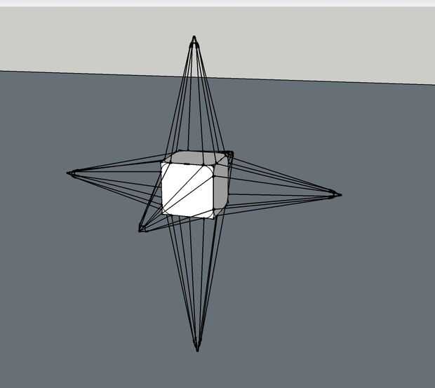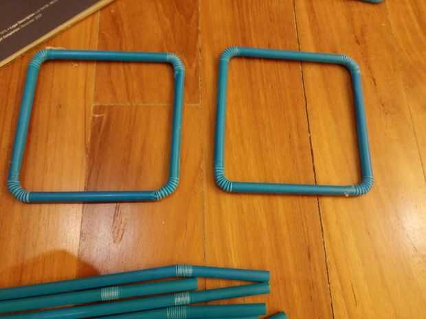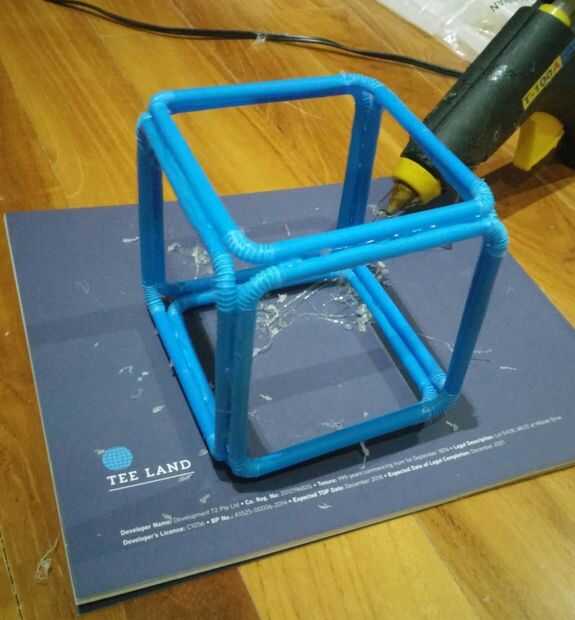 Empezar por hacer un cubo interno aproximadamente 10cm (4 pulgadas) por lado. Esto fue todas hecho con la paja de diámetro más estrecha que las principales armas de la estrella serían leer más obvio que la estructura interna. Todo es sólo caliente-pegados juntos.