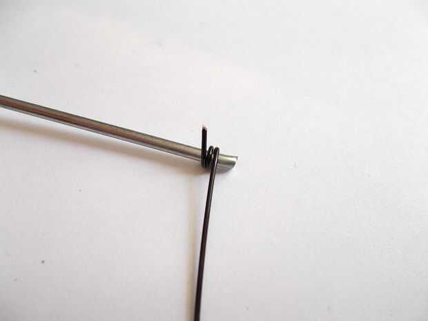 Para perchas, corte el exceso excepto el pedazo recto más largo de alambre que puede salvaje de ella. Alicate para rizar las puntas en bucle si es posible, pero sólo tomé algunos alambre de cobre de 20 calibre que tenía y envuelto alrededor de los extremos para que no se deslice hilo.