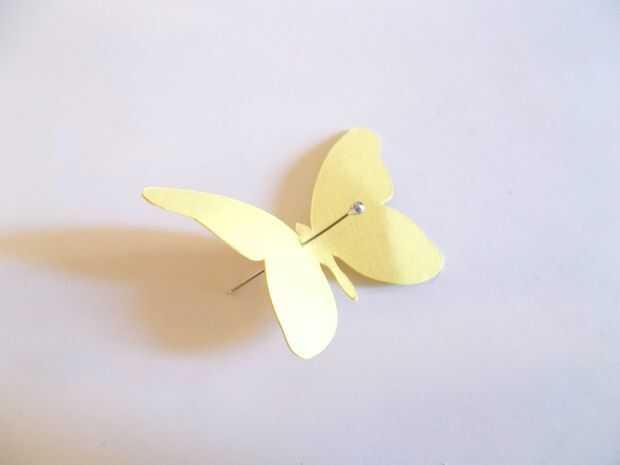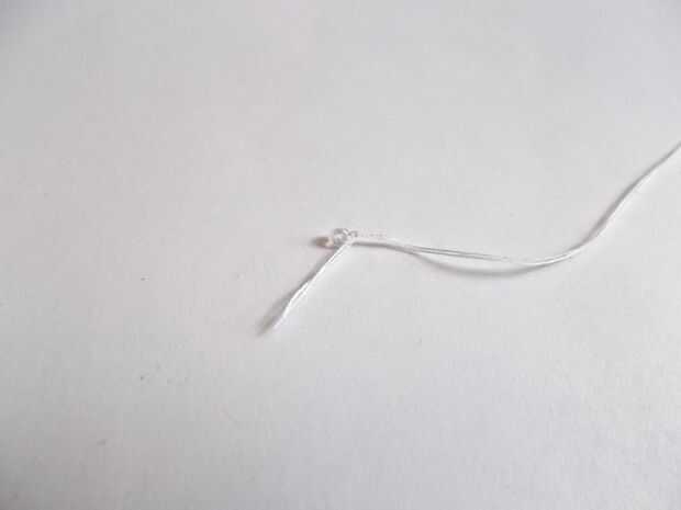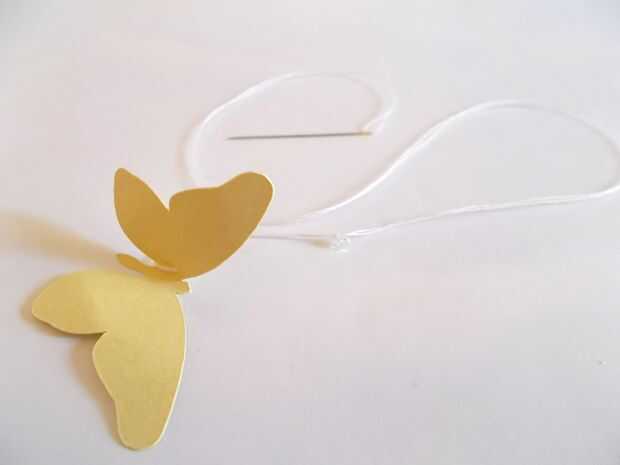 Coge tu material encordado, hilo o pesca de línea (utilicé una mezcla de ambos porque no pude encontrar el sedal al principio).. Corte una longitud para cuánto tiempo desea que la cadena de mariposas que e inserte una tira sobre él con una aguja o nada en absoluto (la línea de pesca es lo suficientemente rígido para el último). Haga dos nudos en el BID en el extremo de la cuerda para asegurar antes de ensartar en una mariposa. Puede usar una aguja ya unida a su cadena a Hágale un agujero, pero no quiero opacar mi aguja en el hilo usé un taladro previamente poked desde un headpin. Repita el proceso de tendido en un cordón, atar dos nudos para fijar y agregar una mariposa--hasta que estés satisfecho con la longitud. Asegúrese de que hay suficiente espacio en la parte superior para atar a la barra más adelante.
