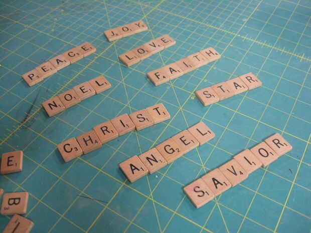 Organizar algunas palabras que te gusta, asegurándose de que encajan uniformemente en las bandejas. Decidí ir con palabras más cortas porque veía mejor como adorno. Además, no tienes que usar palabras de vacaciones. Si estos son un regalo, usted puede poner el nombre de una persona, o un nombre de familia o lo que sea. Estoy todavía en la búsqueda de otro juego por lo que cada uno de los nombres de mis hijos, puedo hacer también.