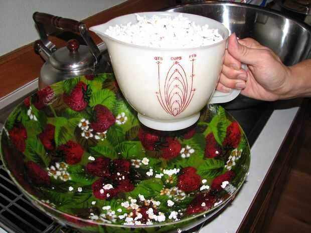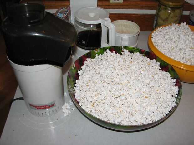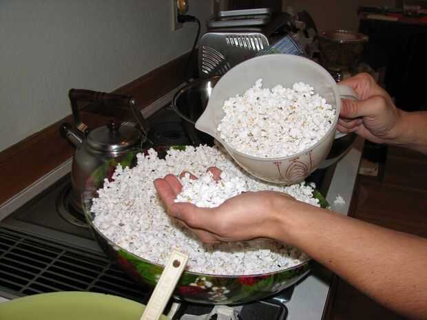 Palomitas de maíz hecho estallar sin núcleo que se encuentran el de las palomitas bolas pueden romper los dientes. Por lo una buena idea para tamizar las palomitas de un recipiente a otro para evitar un accidente doloroso y costoso.