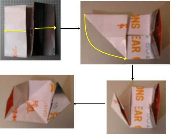 Desplegarlo y doblar una esquina hacia el otro lado (ahora tenemos una forma del triángulo en un lado); doblar nuevamente por la mitad, por lo que vas a obtener un triángulo más pequeño; desplegarlo y hacer lo mismo con el otro lado (ver el patrón de pliegue, ahora es más complejo. Importante: en este punto no es necesario desplegarlo, solo quería mostrar cómo el patrón de pliegue cambia mientras que hacemos más pliegues)
