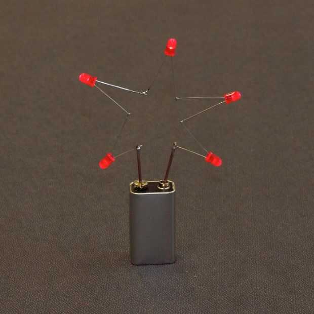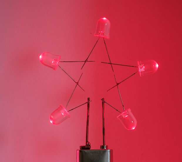 Si puede soldar un poco, puede hacer estrellas LED. Las estrellas pueden realizarse 6 a 10 cm de ancho y utilizan una batería de 9 voltios como un pedestal.
