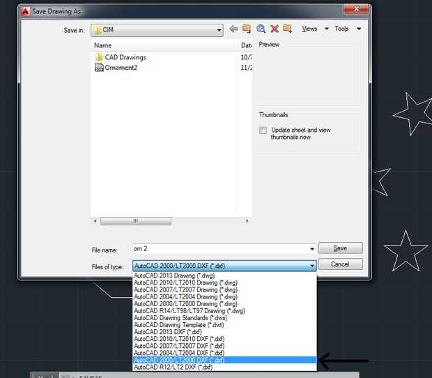 Después de añadir los toques finales a su diseño, es el momento de guardar el archivo y convertir a un DXF. Ahora, estoy utilizando el software AutoCAD y convertir en DXF para el programa CorelDRAW. No estoy seguro si el proceso es universal entre todos los programas.