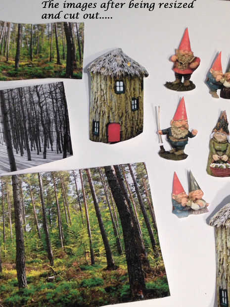 Elegir la gente de Gnome, algunas casitas y un par de escenarios naturales o de fondopara armar en diferentes combinaciones para hacer único cada ornamento...