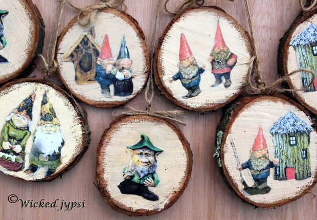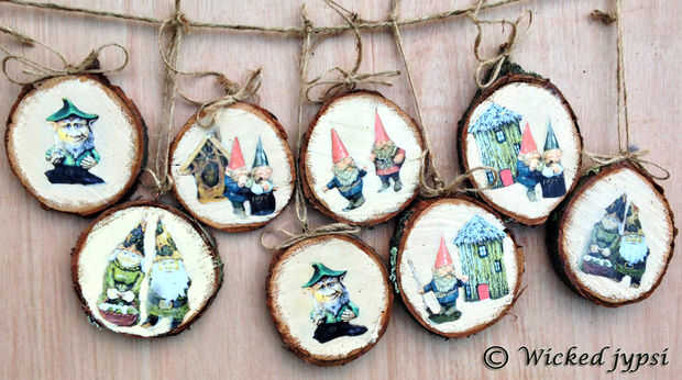 http://wickedjypsi.blogspot.com/2014/01/Sliced-Wood-Ornaments-gnomesyear-round.html