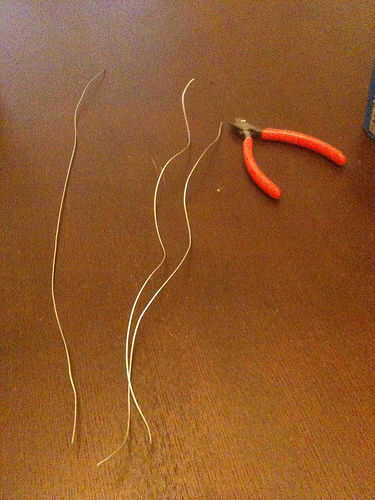 3.) arte alambre, rescate de alambre, o algunos otros alambre rígido apto para la fabricación de los soportes de suspensión. Usé alambre de acero inoxidable aviones lock, porque tenía algunos ahí el garaje.