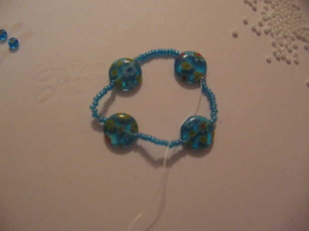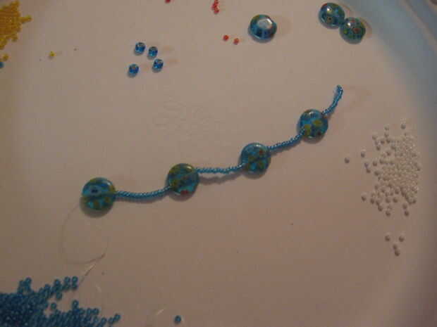 Poner 15 rocallas en el hilo, he encontrado que empatando un nudo alrededor de la primera en ayuda a mantenerlos en allí. De lo contrario ellos no se todos deslice. He utilizado 15 mostacillas azules.
