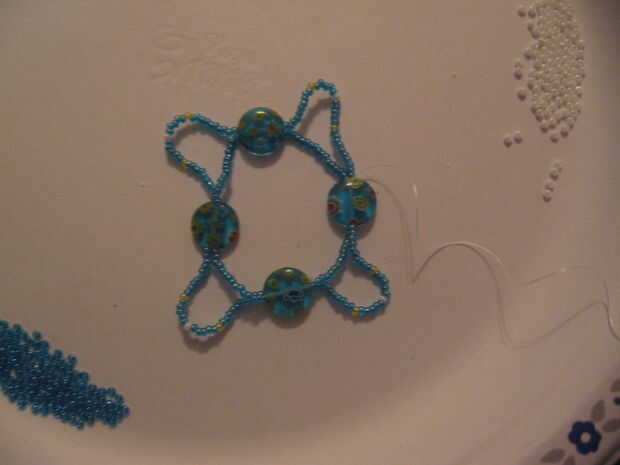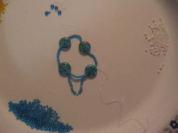 Hilo fantasía grano en grano 33 semilla. Usted puede hacer un patrón o granos de las mismas. He utilizado 10 cuentas azules, 1 grano amarillo, 5 cuentas azules, 1 grano blanco, 5 cuentas azules, 1 grano amarillo y luego 10 cuentas azules.