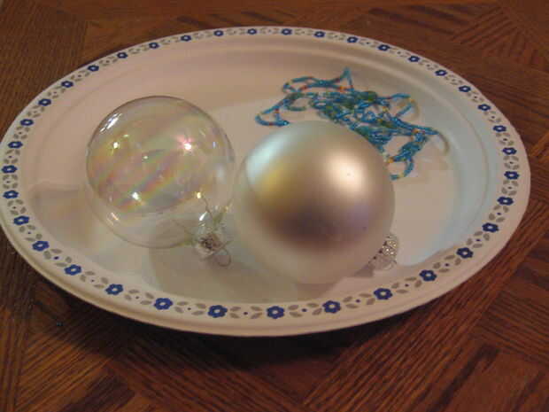 Encontrar una bola de Navidad que corresponda o contrastes o lo que sea para los granos utiliza. Coloque los granos en el adorno en la parte superior. Permanecerá en su lugar por la gravedad. Colgar en un árbol o de cualquier otro lugar los pondría.