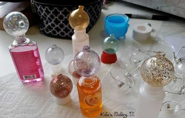 Si utilizas adornos más grandes, algo así como un tarro de masón trabajará para apuntalar los ornamentos. Mis adornos son muy pequeñas, sólo cerca de 1.5" de diámetro, usé sus tapas y botellas de la loción para fijar para arriba!