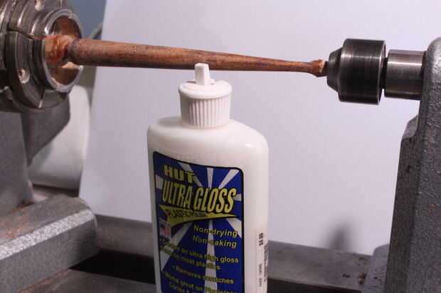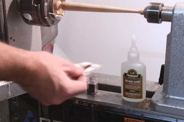 Usando su toalla bien doblada, coloque una gota de guisante grande tamaño "Medio" CA en su toalla doblada y con el torno corriente, aplicar el CA al remate. Trate de hacerlo lo más rápido posible ya que seca rápidamente en la mayoría de los casos. No deje su torno, pero dan que unos aerosoles del activador y se deben endurecer al instante espere hasta que esté completamente seco antes de colocar la capa siguiente. No trate de hacer demasiado espesor de una capa de CA aquí. El alumbrador las capas y más capas tiene mejor los resultados. Si pones demasiado en usted se encontrará lijar duros golpes crujientes de CA seca fuera el remate. Sólo tómate tu tiempo y usar capas ligeras y spray activador entre.