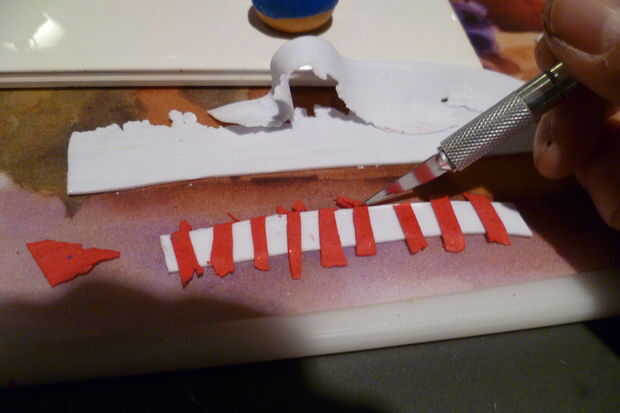 Trocear la arcilla roja fina rectangular y agregar el el barro rectangular blanco para hacer rayas. Recortar los bordes que sobresalen.
