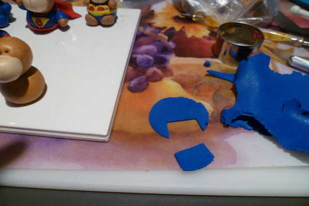 Corte un pedazo rectangular pequeño del círculo de arcilla azul y añadir a la cabeza.
