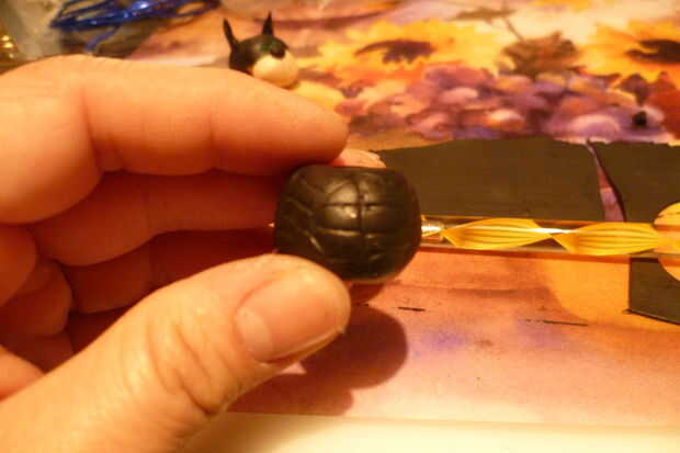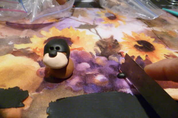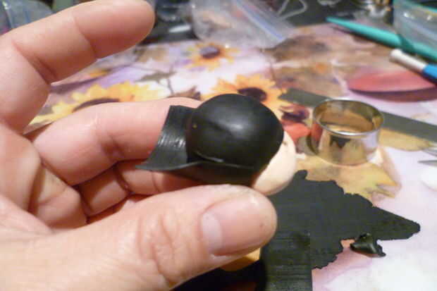 Usando un cortador redondo, corte un pequeño pedazo redondo de barro negro. Envuelva la pieza redonda alrededor de la cabeza, exponiendo solamente la boca.