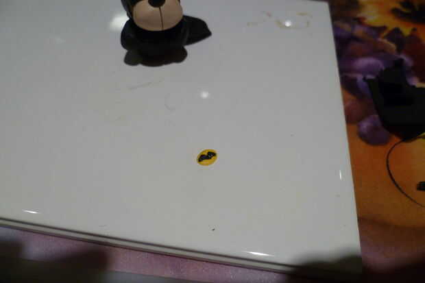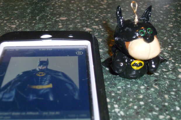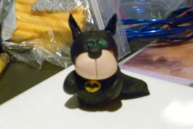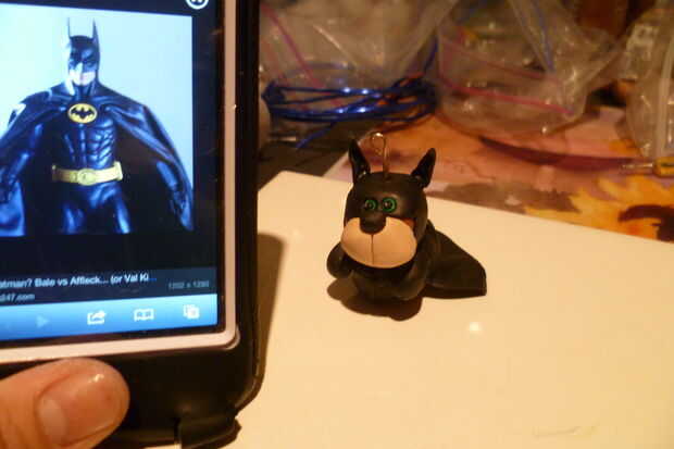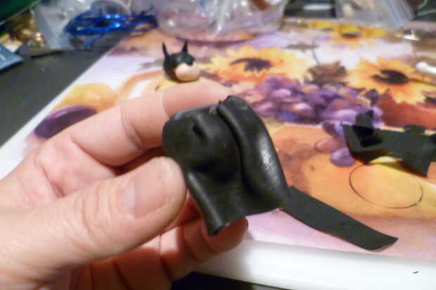 Un pequeño trozo de barro negro del rodillo y cortar en 2 pedazos. Doblar ambas piezas de barro negro en la mitad y añadir a la arcilla aplanada amarillo en forma de un murciélago. Añadir la pieza creada para el cuerpo.