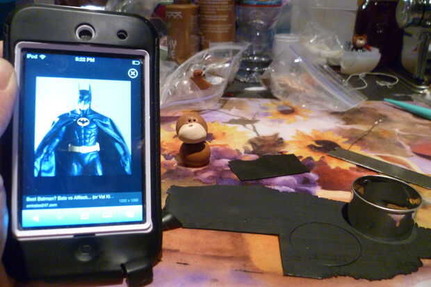 Rodar un trozo de barro negro en forma cónica (ligeramente pegados con cinta en un extremo) para hacer orejas. Lleve la herramienta cónica arcilla e introducirla ontly longitudinalmente el cilindro y rodar un poco para hacer las aberturas de los oídos. Añadir las orejas a la máscara negra.