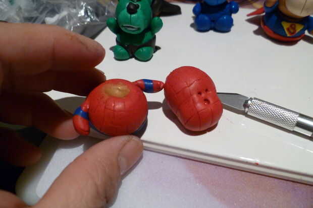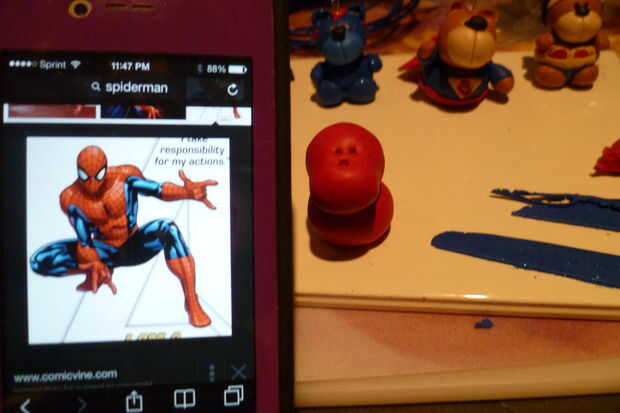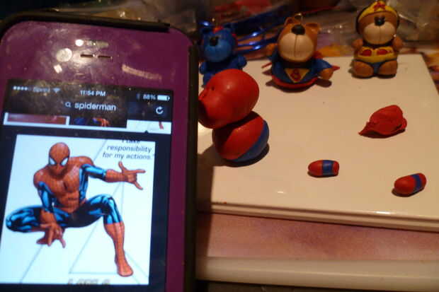 Cortar una pieza delgada y plana de barro azul y añadir a los lados del cuerpo. Siga la imagen de Spider Man como referencia.