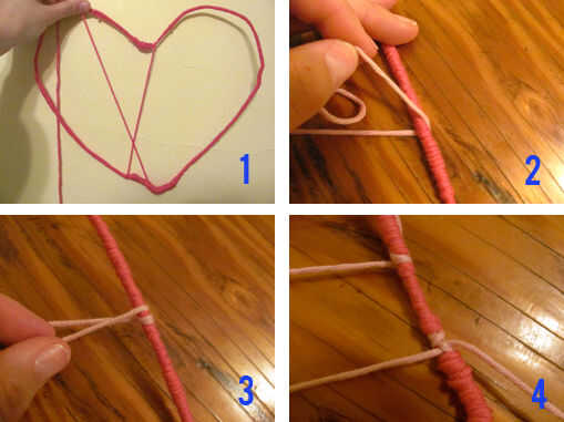 Una vez que haya terminado de envolver el hilo alrededor del alambre, comience a enrollar el hilo alrededor de los lados del corazón para un colorido aspecto palmeado (imagen 1). En cada punto de anclaje en la web (imagen 2), envuelva el hilo alrededor (imagen 3). Usar diferentes colores de hilo para esta parte. Una vez que termines con un color, haga un nudo alrededor del alambre (imagen 4) y corte el extremo suelto con sus tijeras.