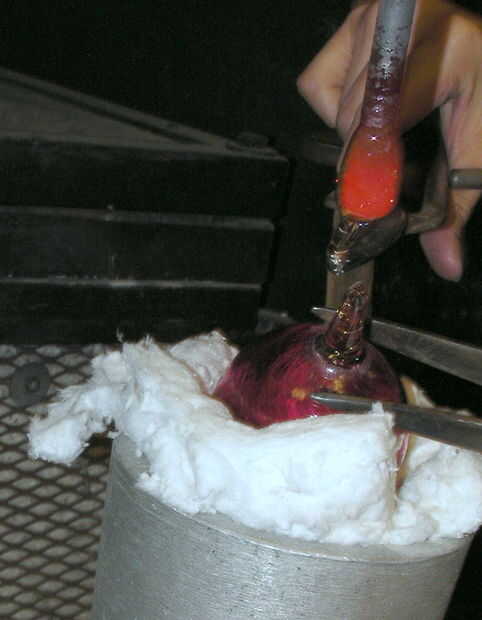 Con el punty algunas pulgadas lejos de la pieza (encontrar la distancia que funciona mejor para usted... no demasiado lejos, no demasiado cerca), quiere agarrar el cristal (más cerca de su ornamento entonces el punty) con las tijeras u o esquileos del diamante y tire hacia arriba y pegarla al vidrio en el punty. Si toca el vidrio caliente a otro vidrio caliente se pegará bien. Ya que no queremos engordar demasiado un bucle que tenemos que fina la cantidad de vidrio que está conectado actualmente a nuestro adorno. La forma de hacer esto, es agarrar el vidrio caliente cerca de ornamento y tire hacia arriba y pegarla al vidrio por el punty. Continuar hacerlo hasta que el vidrio en su ornamento es bastante delgado y crees que sería un bonito lazo.