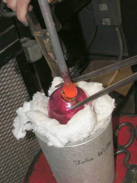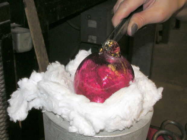 Utilizar las tijeras o Cizallas de diamante para cortar el vidrio y haga que la persona con el punty retirar. Gancho agarrador cerca del final de la Copa con las pinzas y lazo alrededor y toque el extremo del vidrio con el vidrio caliente hacia la base. Esto debe crear un aro pequeño que usted podrá atar cuerdas para colocar un gancho de metal para, o utilizar cualquier otro medio que quieres adjuntar a tu árbol.